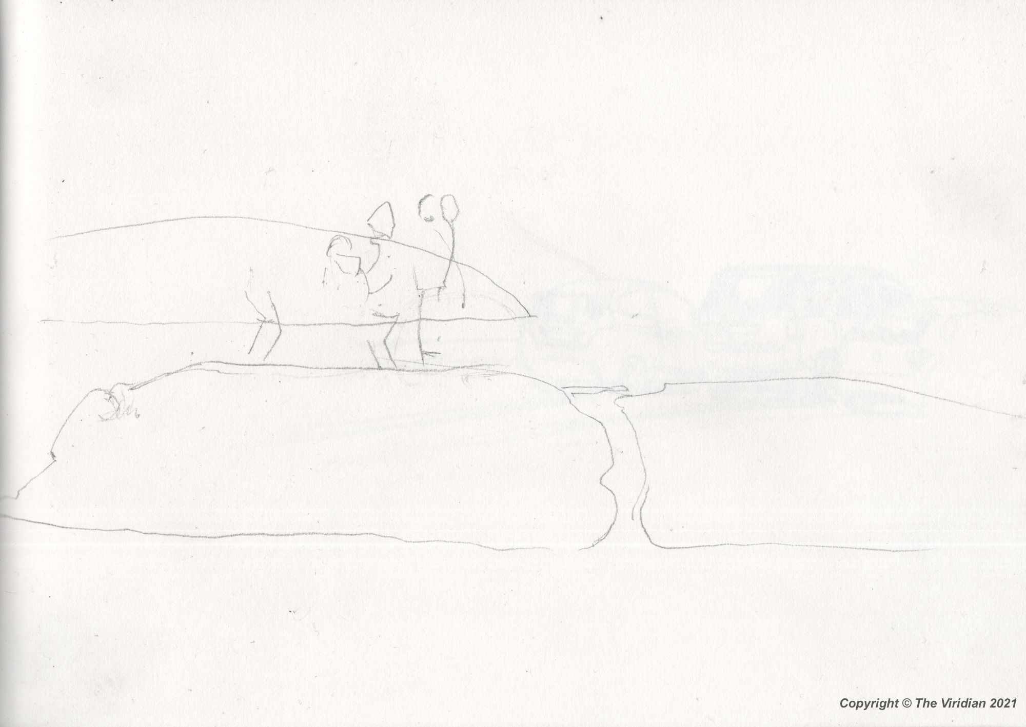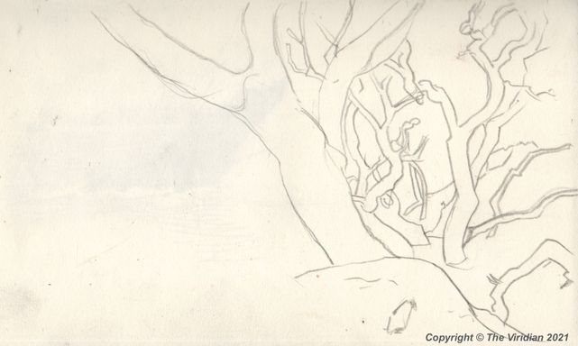 Great stark shapes on a freezing day on the banks of an overflowing Stithians Reservoir. Pencil on paper. Copyright © 2022 The Viridian